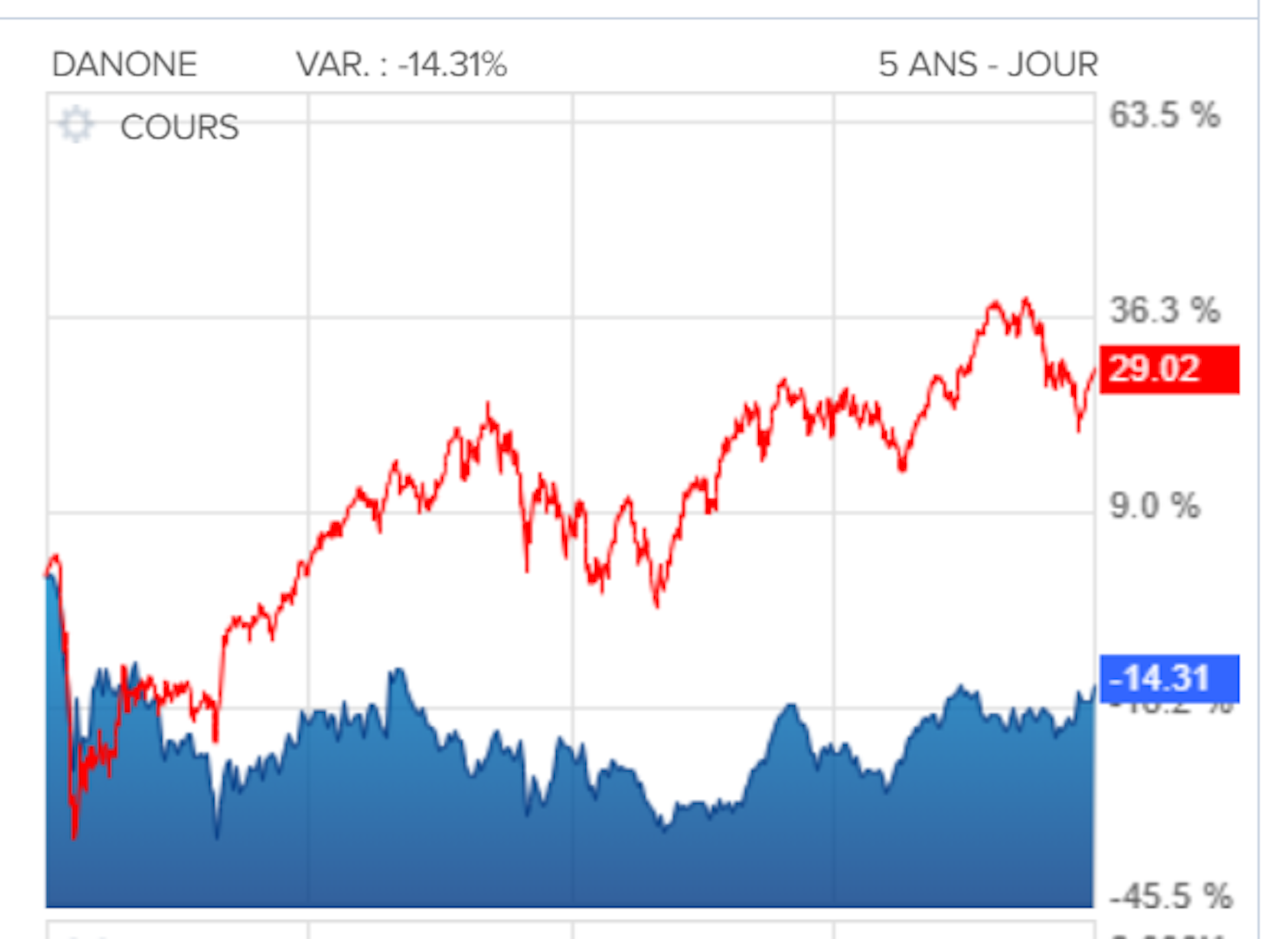 Sa mission chez Danone est clairement de redresser les marges et le chiffre d’affaires du groupe tout en reprenant les ambitions de ses prédécesseurs dans la santé : produits sains, nutrition médicale et infantile. Ceci étant cet élan retrouvé dans les rangs du groupe peine toutefois à se concrétiser sur les marchés financiers. La normalisation n’a pas encore donné tous les résultats escomptés. Le graphique 1 montre le retard de l’action Danone (en bleu) sur le CAC 40 (en rouge) sur les 5 dernières années.